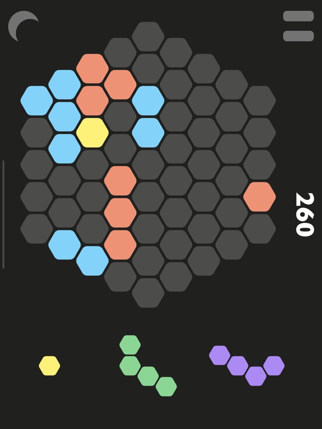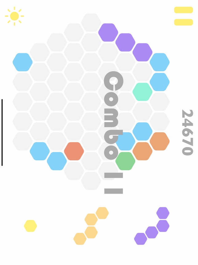 * 当玩家排放的形状组合成六边形,便可消除得分。注意哦,连消越多越有趣哦~