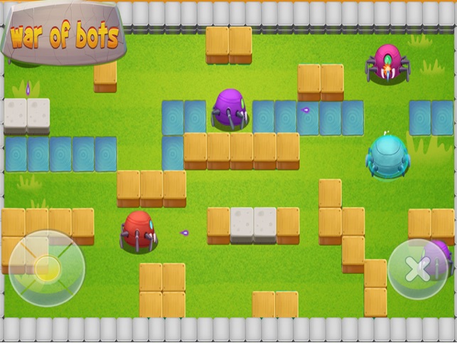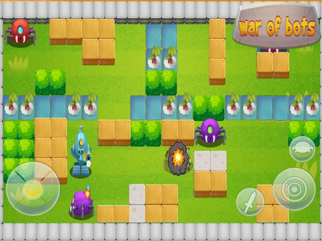 操作方法:点击屏幕左下角的方向键控制机器人移动,点击右下角的发射键发射子弹。