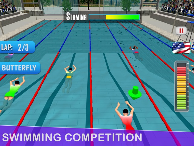 Dive into the beautiful swimming pool, practice in free style and compete with professional swimmers in this swim racing games. Keep Diving into the water pool and keep flipping or taping to attain faster speeds. Free Style swimming is best but you can try other professional swimming styles like backstroke, breaststroke,butterfly store, sidestroke all. Practice these stores, chose your favorite swimming team and beat other swimming racing while flipping all through the water.