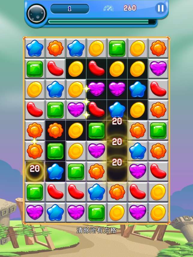 将糖果连线成3个以上来清除方格,并累积能量, 当所有方格都清除後, 再将星星移至最底部即可过关.