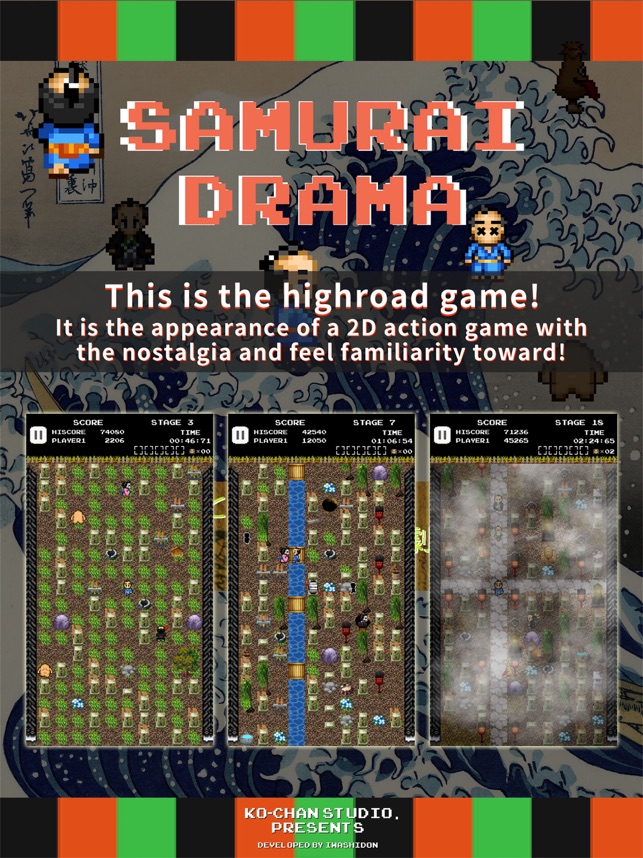 It's a 2D action game using fun pixel art with an authentic Japanese style!