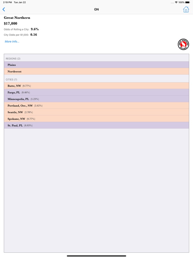 - View detailed Railroad information, including Price, Cities along the Railroad, and odds of rolling a City on the Railroad