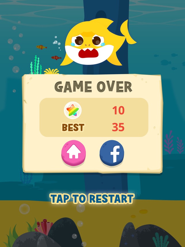 - 轻按鲨鱼宝宝,让他游来游去并吞食星星泡,但要当心障碍哟!