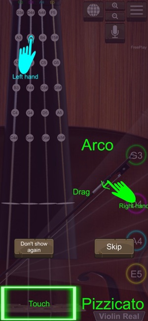 - Professional: Use 2 hands. Use right hand for dragging Violin bow (Arco) or touching Violin string (Pizzicato). Use left hand for choosing note (frequency) in Violin string.