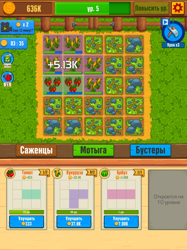 Proper organization is the key to high incomes. All fruits and vegetables have a unique geometric shape and may occupy several cells on the field. Place plants on the field and try not to leave empty cells, that can’t be profitable.