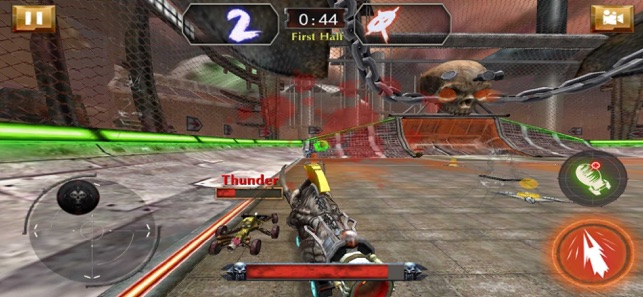 简单的游戏操作:拖移左下角模拟摇杆控制赛车移动努力将足球撞进对手球门得分;使用右方的装备按钮攻击或者防御,限定时间内得分多者即胜利,当然用各种手段将对手变成废铁也并非不可。
