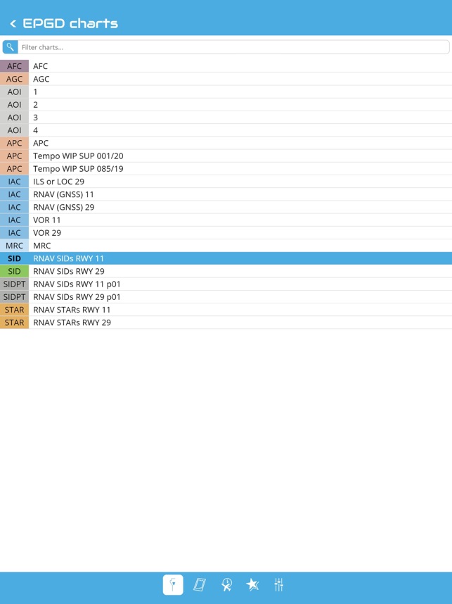 You can search an airport in the airport list. Simply enter your departure, destination and alternate airport in the Quick Flight menu for a quick access to the airport charts. Use the kneeboard feature during your flight to have all needed charts handy.