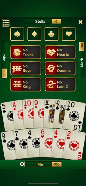 In the course of a session, each player will play two trump and three negative contracts, so that there are 20 hands played in all.