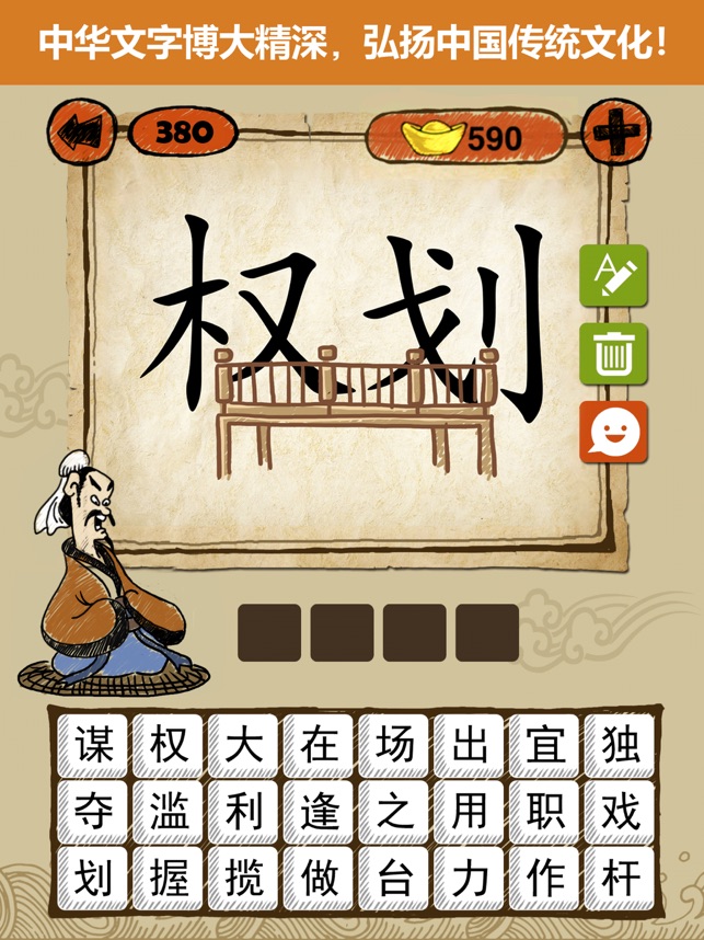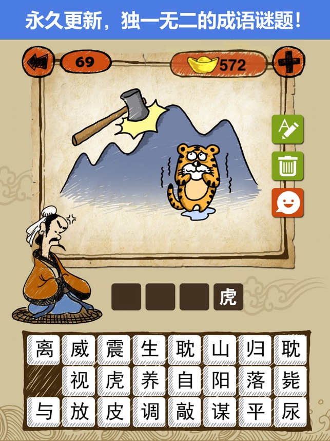 网友马保国闪电5连鞭评价说: 值得收藏的游戏!。我们学校很多学生玩这个,据说老师会从里面出一些题考我们的发散性思维。好吧,我的下载初衷是为了考试但是玩下来觉得挺有趣的,题目本身非常可爱啊,那个画风有中国味道又很风趣的感觉,像刚才的一厢情愿这个成语,就让人发笑