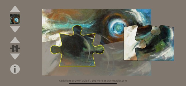 32 jigsaw puzzles of abstract oil paintings by Gwen Guidici. Choose various number of pieces from 4 to 80. Pieces snap into place, so precise positioning is not required. This app is free and supported by ads.