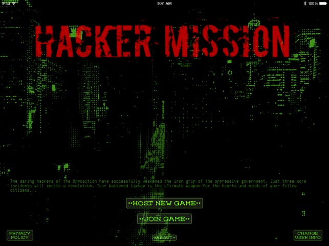 Hacker Mission is meant for in-person play, and uses peer-to-peer connectivity to connect 5-8 players, even in the woods around a campfire.