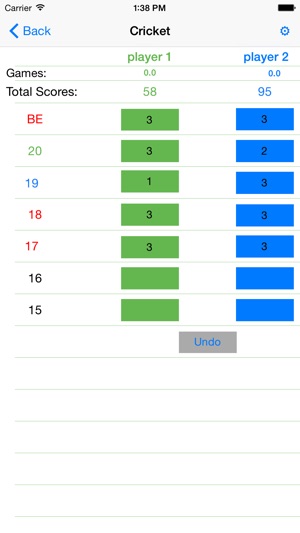The cricket application will track the closing and scoring of numbers for each player. As numbers close they will turn red, as a player starts scoring the number will change the color of the scoring player (blue or green) to indicate the scoring number.