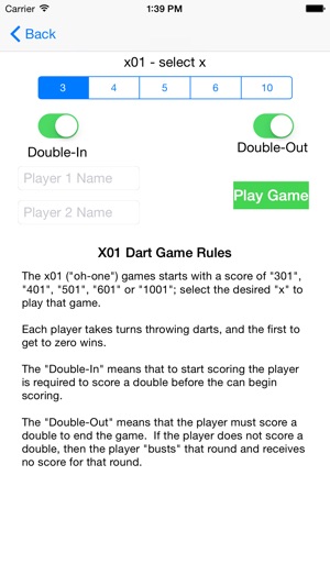 The x01 game allows players to configure the game for the favorite variety of this game: 301, 401, 501, 601 or 1001. It also allows double-in and double-out options (must score a double before you can start scoring, and optionally ending the game with a double score).