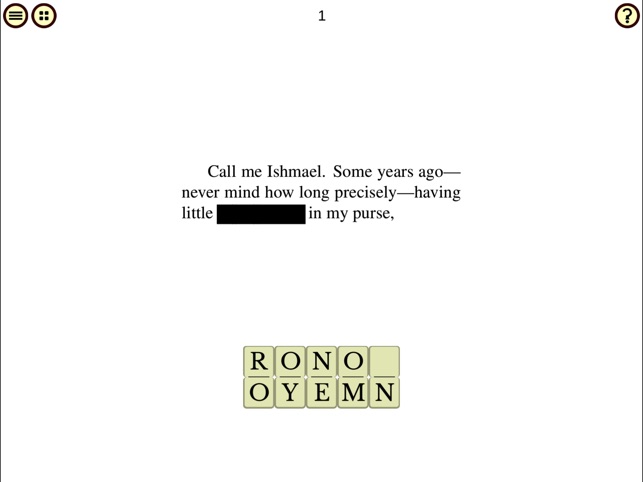 Playing OMBY, you’ll unscramble sets of 1x2 domino word tiles containing portions of text that have been blacked-out, as if by a censor's pen. As you solve each puzzle, the blacked-out text is revealed. Pause periodically to savor the completed paragraphs.